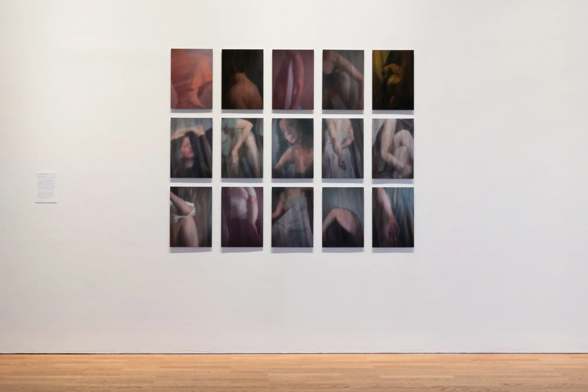 A straight on view of Motae, a photographic series by Louise, displayed on a white gallery wall at MIMA as part of Towards New Worlds. The work consists of fifteen photographic prints on aluminium arranged in a neat grid. Each image shows softly focused, abstracted details of the human body in muted tones, creating a sense of movement and intimacy. A wall text label is positioned to the left of the grid, with wooden gallery flooring visible below.