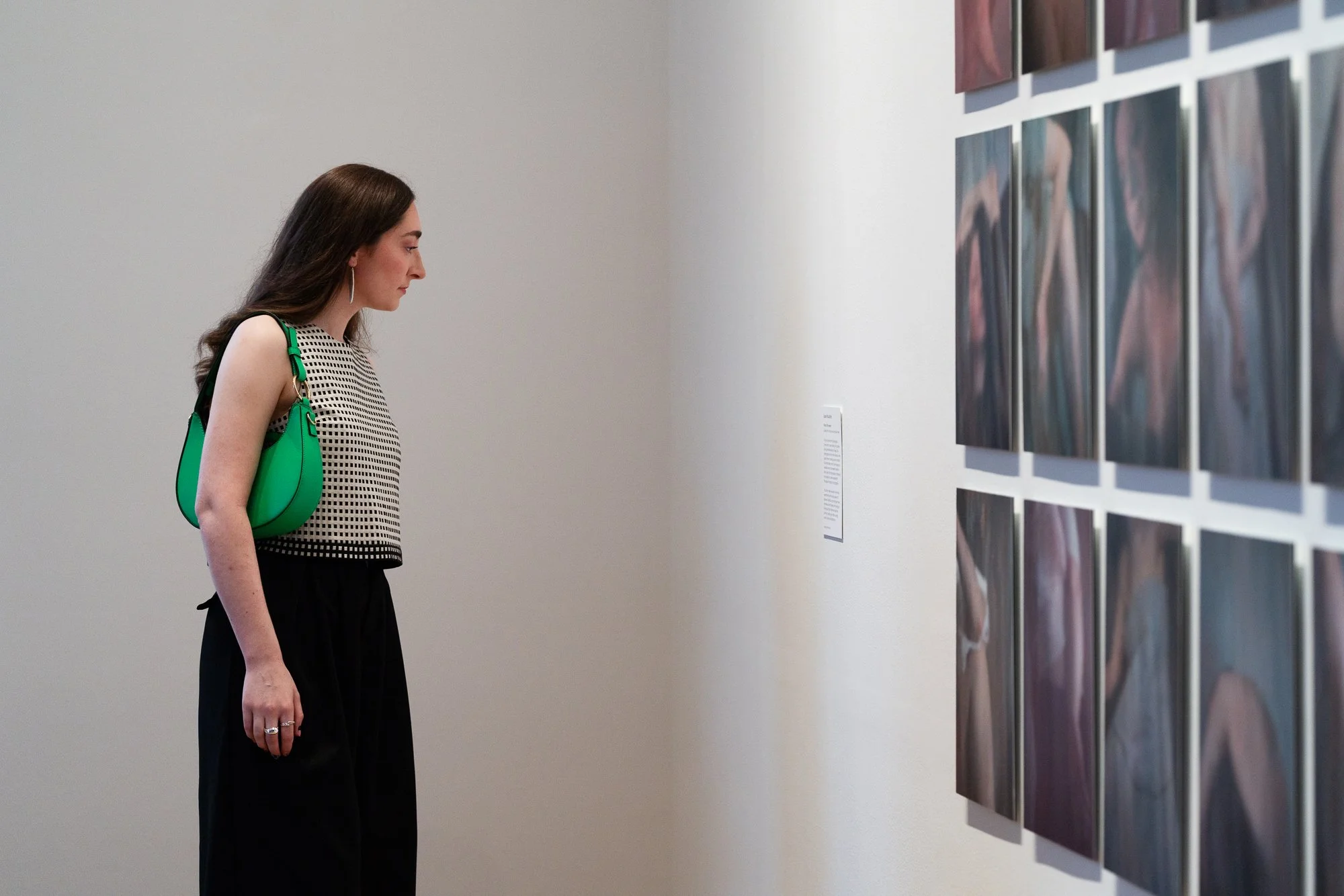 A photograph showing a visitor standing in a gallery space, viewed in profile, looking closely at Motae, a photographic series by Louise exhibited at MIMA as part of Towards New Worlds. The visitor stands facing a white gallery wall on which several small photographic prints are arranged in a grid. She wears a sleeveless patterned top, black trousers, and carries a bright green shoulder bag. The artworks appear softly blurred and painterly, depicting close-up fragments of the human body.